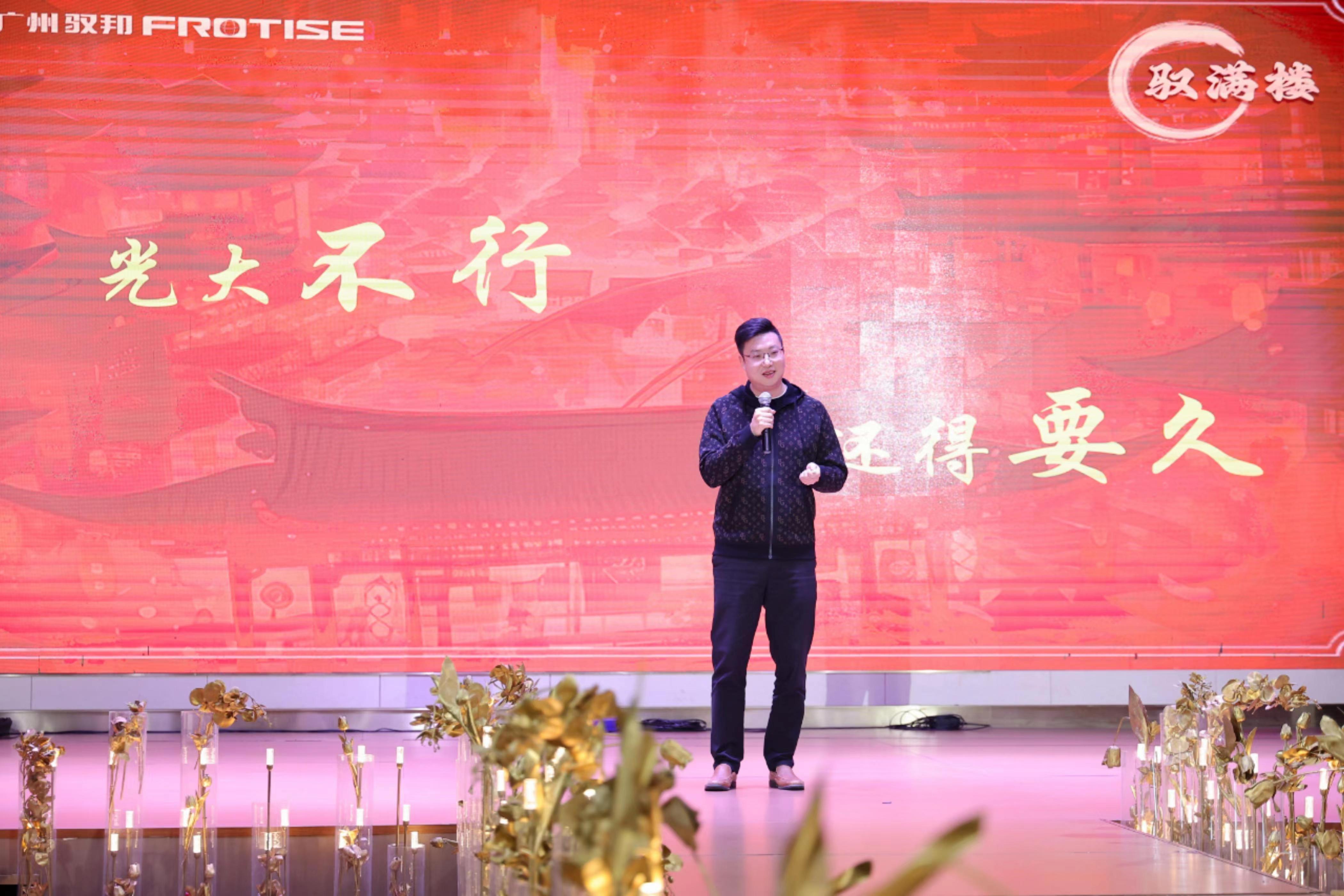 總經(jīng)理劉總,帶著他特有的幽默和智慧,分享了與公司另一位創(chuàng)始人李總(李木)的相識經(jīng)歷,一句“丟磊老木”讓全場笑聲不斷。他深信“光大不行,還得要久”,這不僅是馭滿樓大當(dāng)家的經(jīng)營哲學(xué),也是他自己的經(jīng)營理念,他認(rèn)為對于戰(zhàn)略性的機(jī)會要尋找,同時在沒有找到之前,一定要穩(wěn)住,不見兔子不撒鷹。最后他祝愿馭滿樓在龍年能夠飛龍?jiān)谔?,利見大人?br />